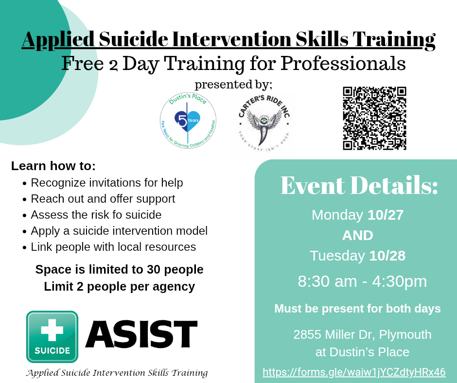 2 Day Training for professionals provided by Dustin’s Place and Carter’s Ride. Trainings will be held on Monday October 27 and 28th from 8:30-4:30. Participants must be present both days.